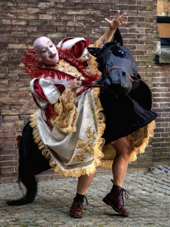 Mit diesem Akt möchte Frans Custers ein visuelles Spektakel schaffen, das sowohl verbal als auch nonverbal Gestalt annimmt. Seine Qualität als Straßenkünstler ergänzt er durch Einflüsse aus Tanz und Performance. Absurdität und Ästhetik dominieren dabei.